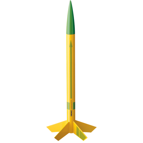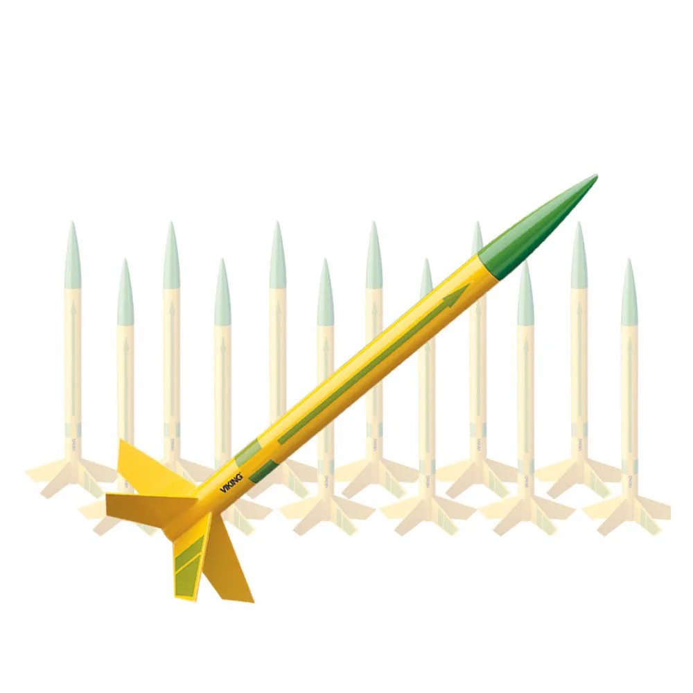 This easy-to-build, Skill Level 1 rocket kit includes a molded nose cone, a single piece body tube, card stock fins and self-stick decals. It's another friction fit, standard engine rocket that requires simple painting. The Viking can reach amazing launch heights over 1,600 feet and will drift back to earth on a bright streamer. The Viking is our most economical bulk pack rocket, so if youve got a tight budget it's definitely the one for you!