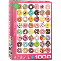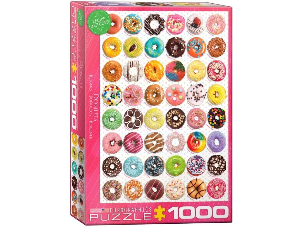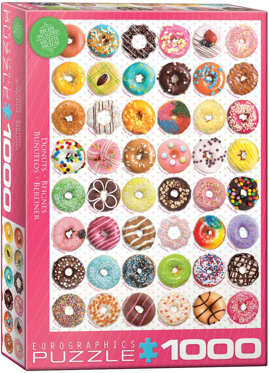 EuroGraphics Donuts 1000-Piece Puzzle. Enjoy putting together this puzzle with 48 donuts and zero calories! Recipe included on the back of the box. Strong high-quality puzzle pieces. Made from recycled board and printed with vegetable based ink. EUROGRAPHICS puzzles are both fun and educational. Puzzle pieces are made from 1.75mm blueboard, and are 100% recyclable, and printed with vegetable-based inks. Finished Puzzle Size: 19.25" x 26.5".