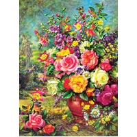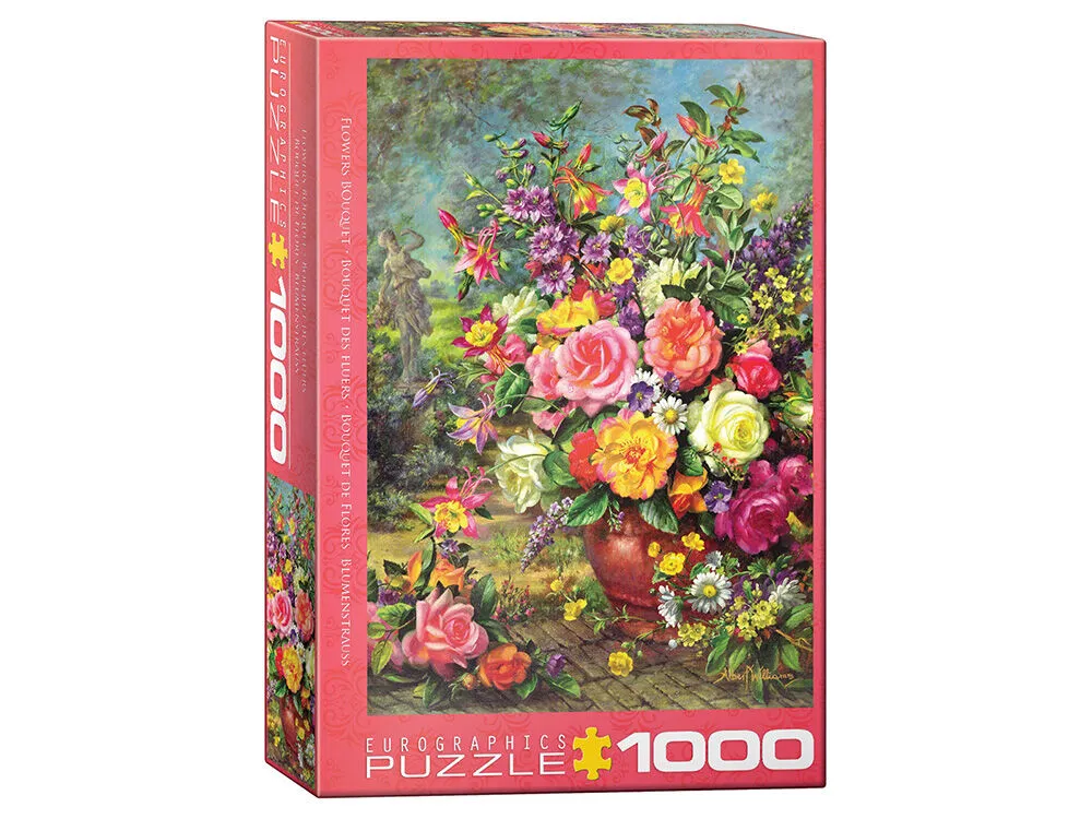 SKU: EUR65883 | Brand: Eurographics Puzzles | Product: Eurographics 1000pc Flower Bouquet Jigsaw Puzzle The Eurographics 1000 Piece Puzzle: "Flower Bouquet" displays a detailed floral arrangement in a vase, featuring roses, peonies, and complementary blooms. Artwork by Albert Williams Strong, this puzzle captures varied flower types and colorful botanical detail. The puzzle pieces are precision-cut and manufactured from recycled board using vegetable-based printing inks. Upon assembly, the completed puzzle serves as wall-mounted artwork. This 1000-piece configuration provides an extended assembly timeframe with standard puzzle piece quality and durability.