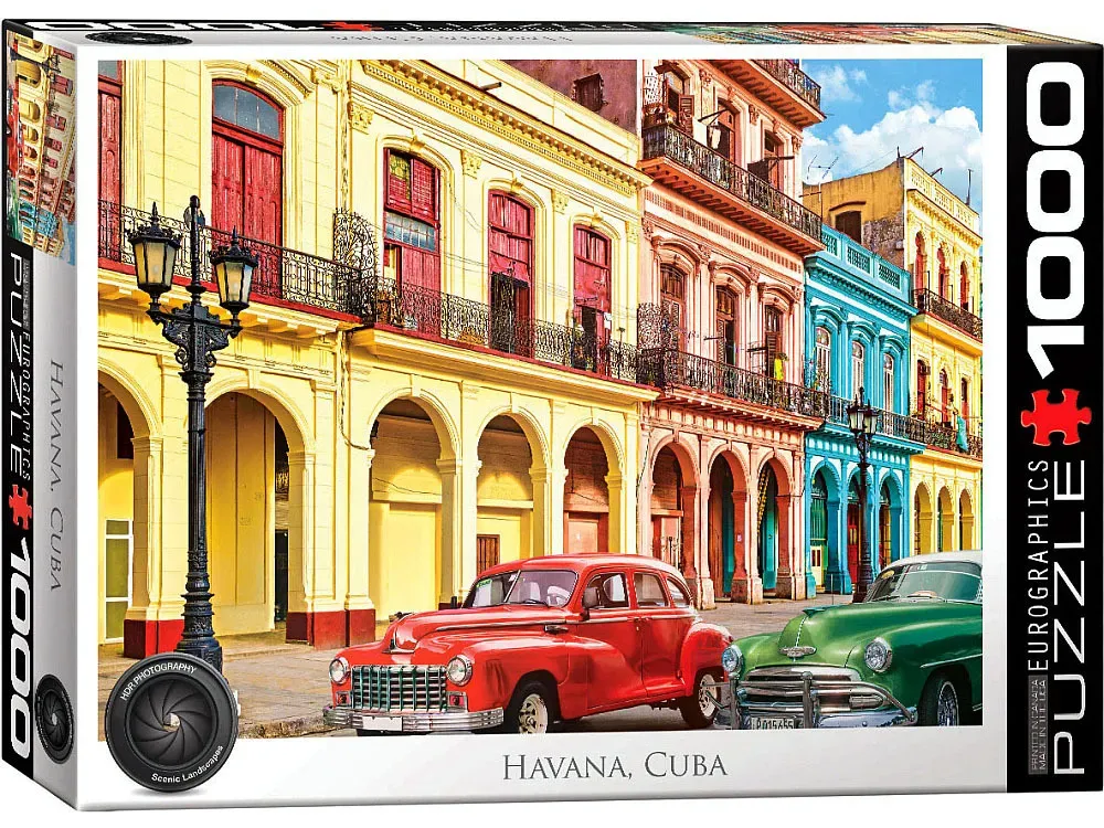 Also in Old Havana is the baroque Catedral de San Cristóbal and Plaza Vieja, whose buildings reflect the city’s vibrant architectural mix. 1000-Piece Puzzle Box size: 10" x 14" x 2.37" Finished Puzzle Size: 19.25" x 26.5" Eurographics puzzles are made according to high standards; 100% recyclable materials, non-toxic and vegetable based inks, 0.07" blueboard for exact piece fit without fraying, and certified by the Forest Stewardship Council.