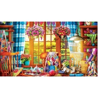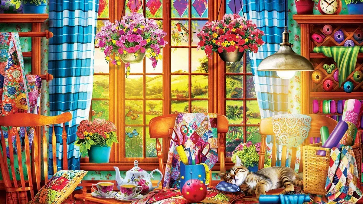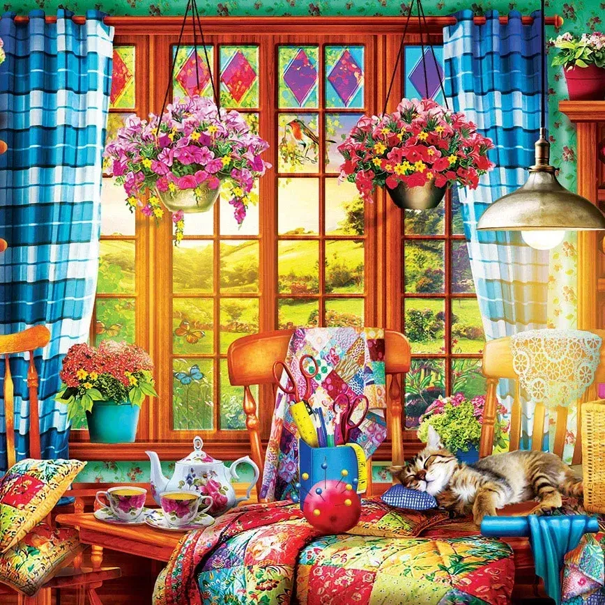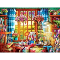 Eurographics Quilting Craft Room 1000 Piece Jigsaw Puzzle, Vibrant colours come to life in this picturesque setting, makes for a bright and colourful puzzle