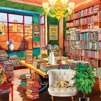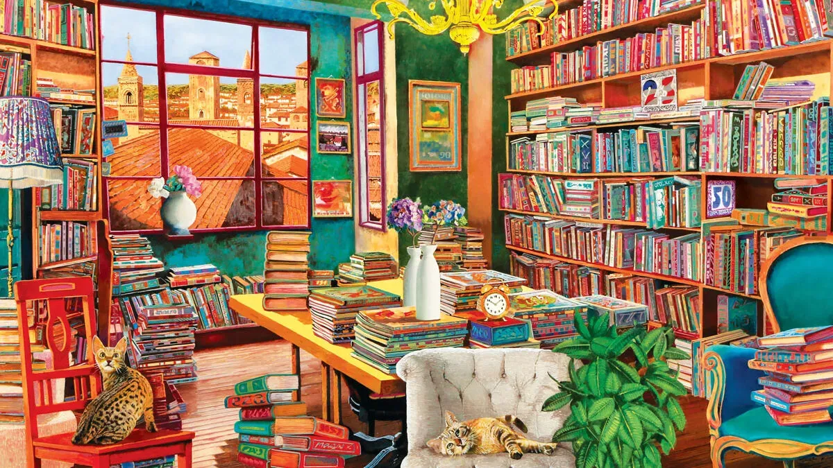 An amazing collection of books decorate an old library room, while two cats lie restless awaiting a visitor.