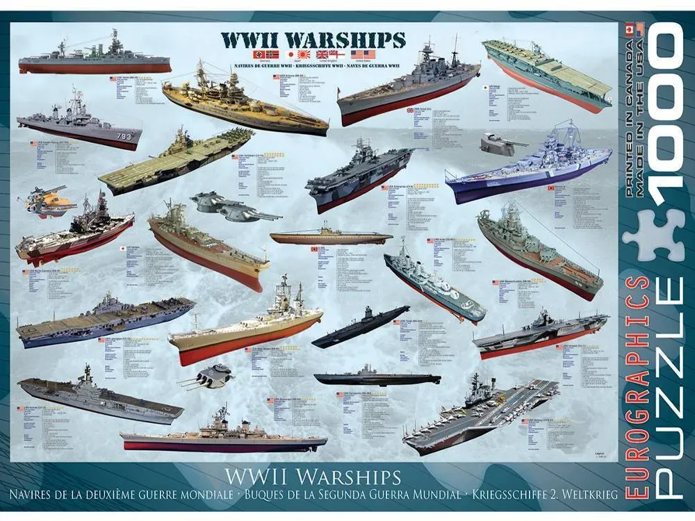 EuroGraphics WW II Warships 1000-Piece Puzzle. US, British, German and Japanese World War II warships are depicted along with vital information such as class, type, launch date, years of service, fate and general specifications.