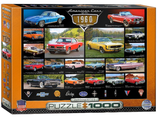 Box size: 10" x 14" x 2.37". Finished Puzzle Size: 19.25" x 26.5". From the drive-thru to the drive-in, you would be turning heads in any of these classic rides. The 1960s gave us some of the finest automobiles in history; see them all with our classic car chart. This puzzle showcases a pivotal decade in automotive history. The 1960s saw the rise of muscle cars with powerful V8 engines, bold styling, and a focus on performance. Icons like the Mustang, GTO, and Camaro reflected a booming youth culture and redefined American car design. Strong, high-quality puzzle pieces. Made from recycled board and printed with vegetable-based ink. Orientation: Horizontal Box size: 10 x 14 x 2.37 in (25.4 x 35.6 x 6 cm) Assembled puzzle size: 19.25 x 26.6 in (48.9 x 67.6 cm)