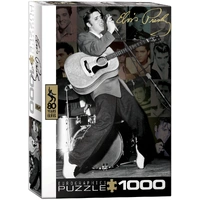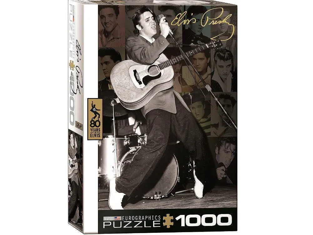 Eurographics Elvis Presley Live at the Olympia Theater 1000-Piece Puzzle This electrifying 1000-piece Eurographics puzzle celebrates the King of Rock and Roll, Elvis Presley! The dominant central image captures Elvis in a dynamic black and white performance shot, guitar in hand and microphone close, showcasing his iconic stage presence.