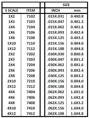 .030" X .030" X 14" / .8mm X .8mm X 35cm DIMENSIONS REPLICATE 2 X 2 LUMBER SIZE IN S SCALE AVAILABLE IN REGULAR AND BULK PACKS