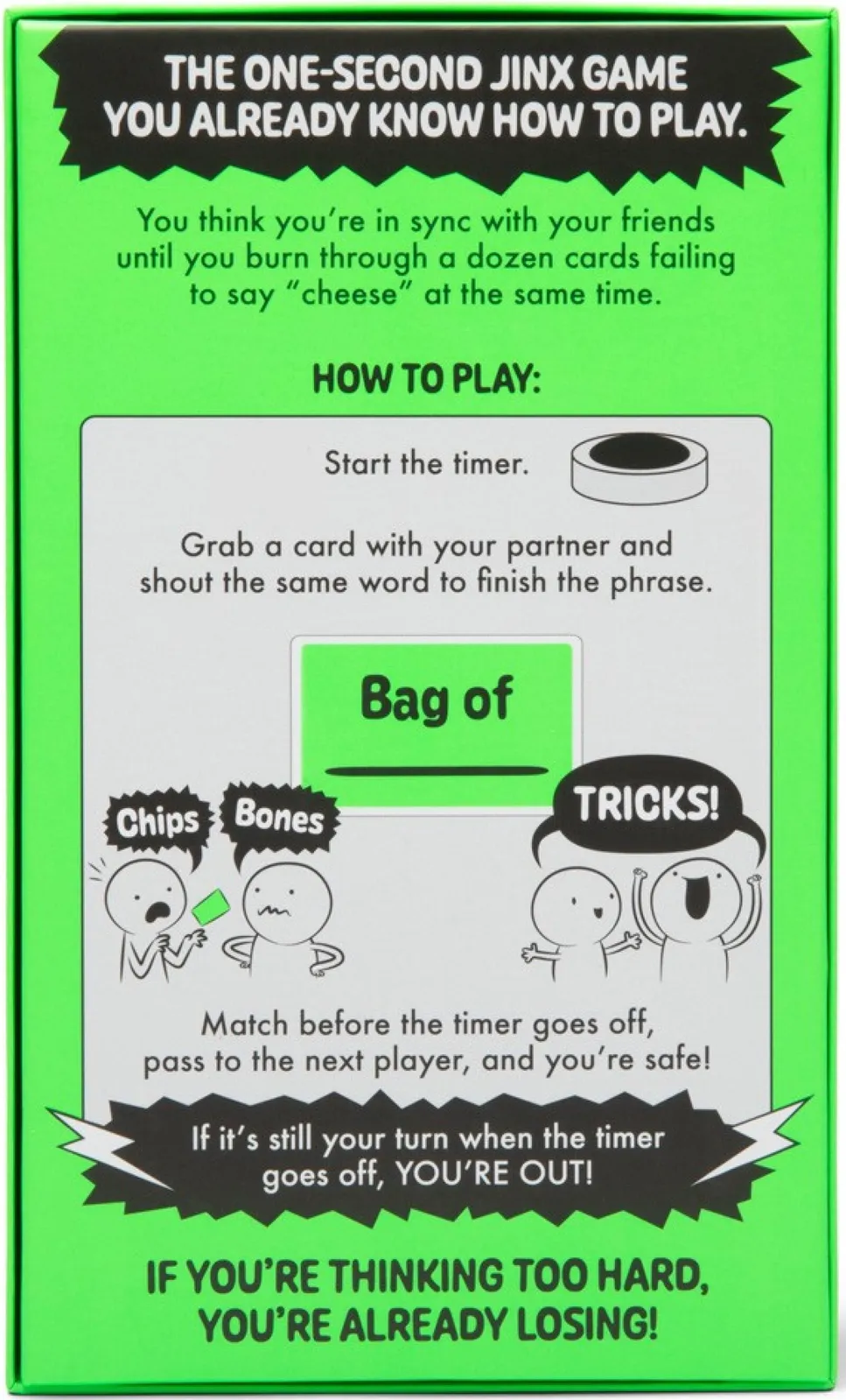 Set the timer and read the word on your card. On the count of three, you and the person to your left have to say the same associated word in unison. If you fail, go again until you match. But hurry, you don’t want to be caught when the timer goes off.