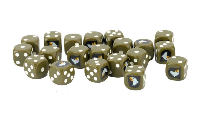 Flames of War's American 101st Airborne Dice Set Contains 20 14mm D6s. The 6 sides have been replaced by the 101st Airborne Division emblem.