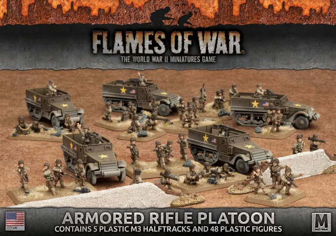Flames of War's Armored Rifle Platoon 4th Edition Package Contents: - 5 x Plastic M3 Halftracks - 5 x Plastic Halftrack Crew Sprues - 2 x Plastic Infantry Sprues - 1 x Decal Sheet - 2 x Unit Cards Package Info: There is never enough infantry in the Armored Divisions to go around, so support from armored infantry companies is always in high demand. - Product is for use in the Flames of War Miniature tabletop game. - Models may require assembly. - Any scenery shown, paint, or glue not included.