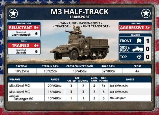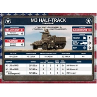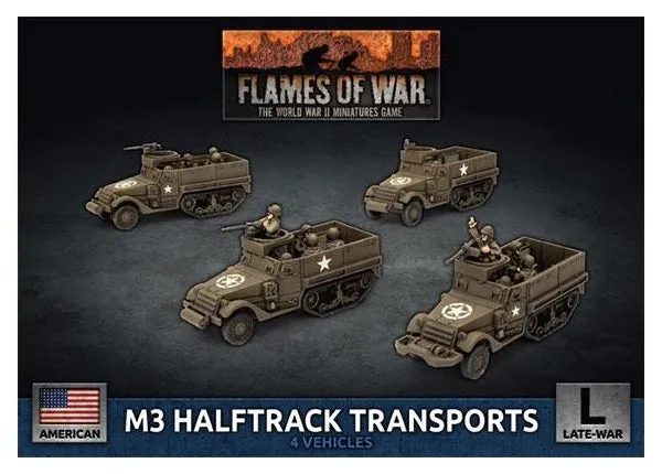 Flames of War: American M3 Halftrack Transports (Late-War) The M3 half-track is the essential US armoured transport, which has been in service since North Africa. These half-tracks come with their own firepower, but in classic American style, they have plenty of hard points to mount even more machine-guns when needed. This package contains four M3 Halftracks, four M3 Halftrack Crew Sprues, one Decal Sheet, and two Unit Cards.
