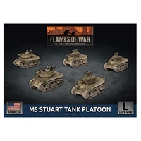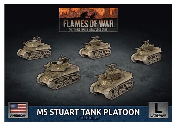 Flames of War: American M5 Stuart Tank Platoon (Late-War) The M5 is the second major version of the Stuart light tank. The new model has a bit more armour protection as well as an larger turret. This package contains five M5 Stuart Tanks or M8 Scott (75mm) Assault Guns, one Decal Sheet, and seven Unit Cards.