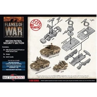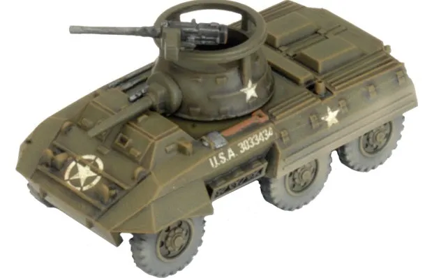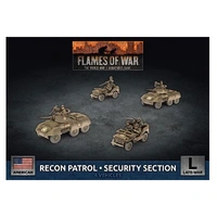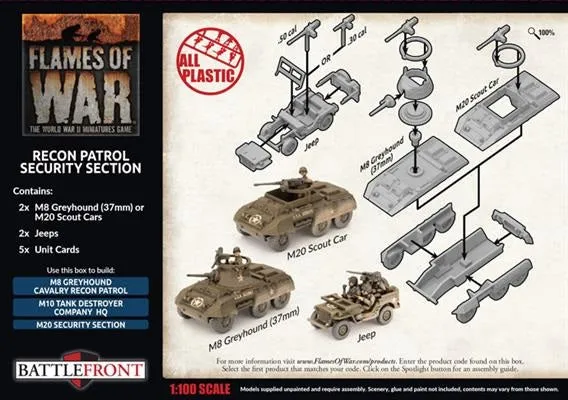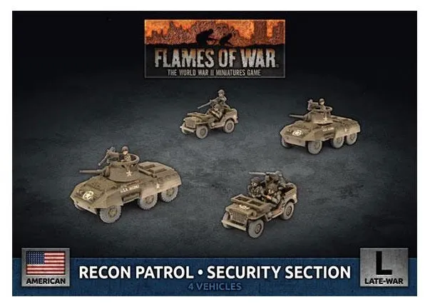 Flames of War: American Recon Patrol or Security Section (Late-War) Cavalry patrols operate over large areas of ground, constantly reporting on German positions, testing and securing bridges, and making contact with local resistance groups. The information collected by these patrols is transmitted using radios to help guide the tanks and infantry. This package contains two M8 Greyhound (37mm) or M20 Scout Cars and two Jeeps.