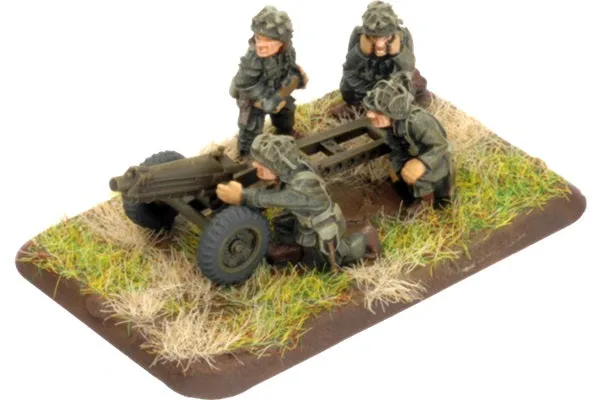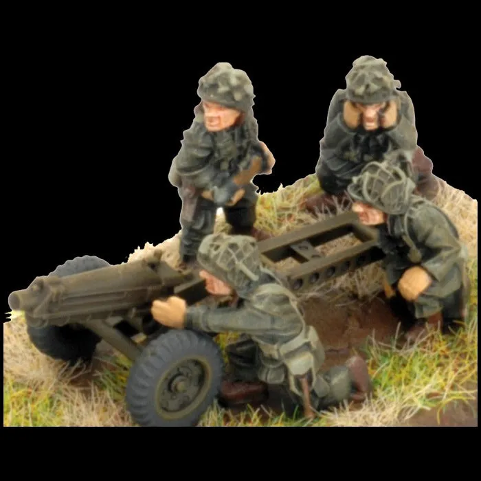 Vital to the survival of the airborne division is the air-transportable parachute field artillery battery equipped with the M1A1 75mm pack howitzer. Each gun can be broken down into nine parachute loads. These are all tied together and dropped as a single aircraft load. If all goes well, they’ll still be all together on landing. The bundles can be quickly located by the crew and assembled so as to go into action in support of the parachute infantry regiments immediately. THIS PRODUCT CONTAINS: 4x Parachute or Glider 75mm Pack Howitzer Teams --- These miniatures are supplied unassembled and unpainted