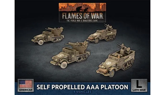 Flames of War's Self-Propelled AAA Platoon Package Contents: - 2 x M15 Half-Tracks with 37mm Gun and Twin .50 cal MGs - 2 x M16 Half-Tracks with Quad .50 cal Machine Guns - 1 Unit Card Package Info: - Product is for use in the Flames of War Miniature tabletop game. - Models are supplied unpainted and require assembly. - Any additional scenery shown, models, paint, or glue not included. Product Part Number: UBX83 Flames of War Unit's Country: United States Flames of War Time Period: WWII