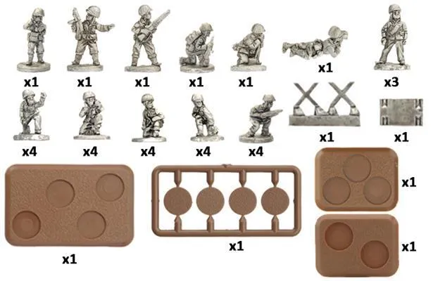 Marine Artillery Group(USO140) Includes Command Rifle team, Staff team, Observer Rifle teams, four gun crews, Small three-hole base, Small two-hole base, Medium four-hole base, and base plug sprue. Models come unpainted and unassmbled. Glue, paint, and other hobby materials sold separately.