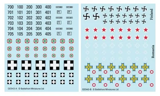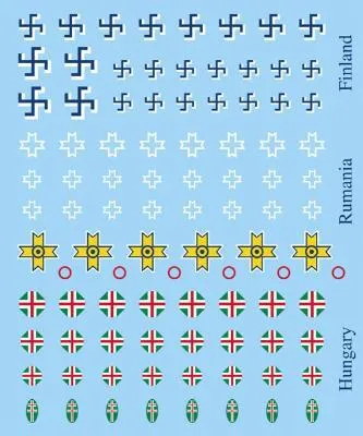The Axis Decal set contains 4 decal sheets. Everything you need to mark your Finnish, Romanian and Hungarian vehicles. THIS PRODUCT CONTAINS: 4x Decal Sheets 2x of each sheet