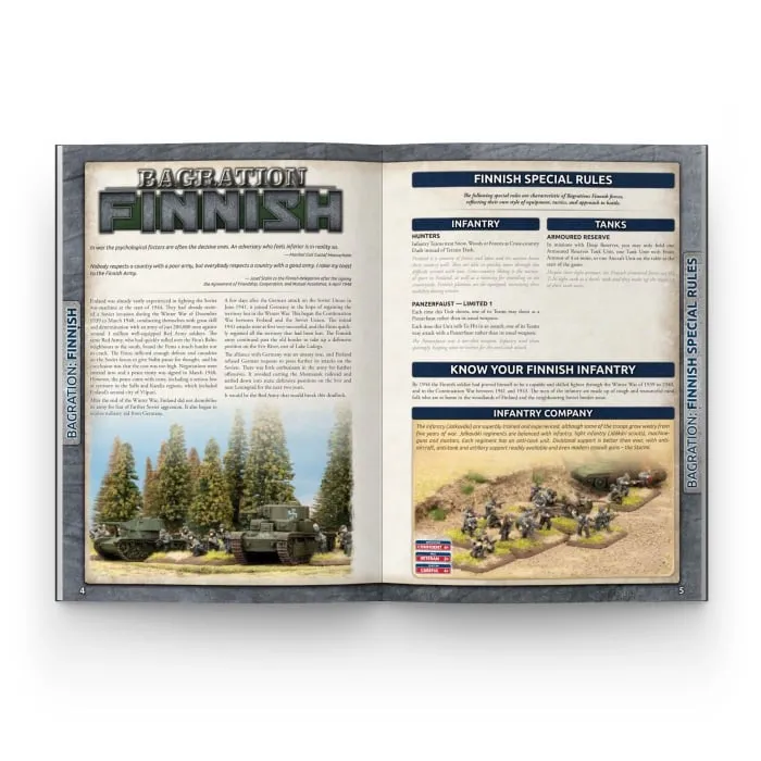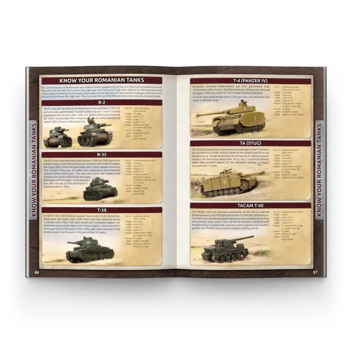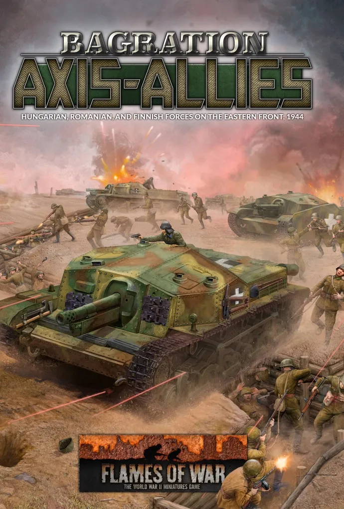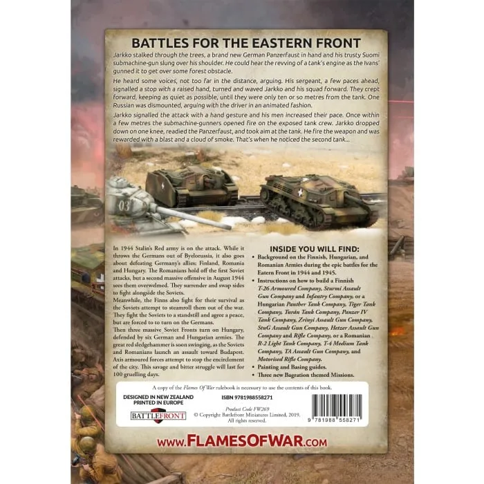 Jarkko stalked through the trees, a brand new German Panzerfaust in hand and his trusty Suomi submachine-gun slung over his shoulder. He could hear the revving of a tank’s engine as the Ivans’ gunned it to get over some forest obstacle. He heard some voices, not too far in the distance, arguing. His sergeant, a few paces ahead, signalled a stop with a raised hand, turned and waved Jarkko and his squad forward. They crept forward, keeping as quiet as possible, until they were only ten or so metres from the tank. One Russian was dismounted, arguing with the driver in an animated fashion. Jarkko signalled the attack with a hand gesture and his men increased their pace. Once within a few metres the submachine-gunners opened fire on the exposed tank crew. Jarkko dropped down on one knee, readied the Panzerfaust, and took aim at the tank. He fire the weapon and was rewarded with a blast and a cloud of smoke. That’s when he noticed the second tank... --- In 1944 Stalin’s Red army is on the attack. While it throws the Germans out of Byelorussia, it also goes about defeating Germany’s allies; Finland, Romania and Hungary. The Romanians hold off the first Soviet attacks, but a second massive offensive in August 1944 sees them overwhelmed. They surrender and swap sides to fight alongside the Soviets. Meanwhile, the Finns also fight for their survival as the Soviets attempt to steamroll them out of the war. They fight the Soviets to a standstill and agree a peace, but are forced to turn on the Germans. Then three massive Soviet Fronts turn on Hungary, defended by six German and Hungarian armies. The great red sledgehammer is soon swinging, as the Soviets and Romanians launch an assault toward Budapest. Axis armoured forces attempt to stop the encirclement of the city. This savage and bitter struggle will last for 100 gruelling days. INSIDE YOU WILL FIND: Background on the Finnish, Hungarian, and Romanian Armies during the epic battles for the Eastern Front in 1944 and 1945. Instructions on how to build a Finnish T-26 Armoured Company, Sturmi Assault Gun Company and Infantry Company, or a Hungarian Panther Tank Company, Tiger Tank Company, Turán Tank Company, Panzer IV Tank Company, Zrinyi Assault Gun Company, StuG Assault Gun Company, Hetzer Assault Gun Company and Rifle Company, or a Romanian R-2 Light Tank Company, T-4 Medium Tank Company, TA Assault Gun Company, and Motorised Rifle Company. Painting and Basing guides. Three new Bagration themed Missions.