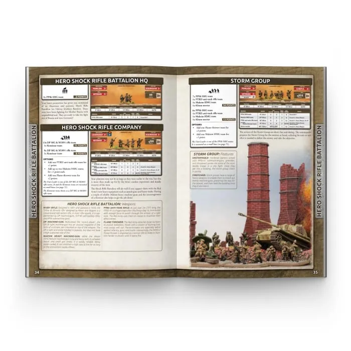 Serzhant Ivanovich motioned his men to stop moving. The village looked deserted, the fascists nowhere to be seen, but he knew they were there waiting quietly. Flashes of thunder snapped Ivanovich back to the present. The heavens opened up and the Soviet ‘God of War’ began to rain down his fury on the fascists’ positions. Shell after shell fell, exploding in great pillars of earth. As suddenly as it began, the thunder stopped. The Kapitan shouted, the Maksim began its chatter, and the troops charged ahead toward the enemy. The Germans woke from their daze and their machine-guns ripping fire began. Mines exploded, adding to the confusion. The German positions were strong and very well-prepared. Accurate cannon fire began hitting the fascists’ lines from a new direction. Ivanovich grinned; the assault guns had arrived! His attack was up and moving! --- During the calm weeks leading up to Operation Bagration, the Soviets have amassed their armies for the greatest offensive yet undertaken on the Eastern Front. Three years after the German invasion, the Red Army stands as battle-hardened troops, ready to finally push the fascist invaders out of Mother Russia! A screaming barrage of shells and rockets signals the beginning of Operation Bagration, and Soviet Rifle Corps charge forward to capture the fortress towns of Vitebsk, Orsha and Mogilov. The Red Army smashes through German Army Group Centre’s front line and then relentlessly advances westward across Byelorussia to threaten Minsk. The Red Army goes on the offensive all across the front, from Finland and Estonia in the north to Poland, Ukraine, Romania, and eventually across Hungary to lay siege to the city of Budapest. INSIDE YOU WILL FIND: Background on the Soviet Red Army during 1944, including Operation Bagration and the breakthroughs that followed. Instructions on how to build an IS-2 Guards Heavy Tank Regiment, IS-85 Guards Heavy Tank Regiment, Heavy SP Artillery Regiment, Medium SP Artillery Regiment, SU-76 Light SP Artillery Regiment, Engineer-Sapper Battalion, Hero Shock Rifle Battalion, Rifle Battalion, Hero T-34 (85mm) Tank Battalion, Hero T-34 Tank Battalion, Hero Motor Rifle Battalion, T-34 (85mm) Tank Battalion, T-34 Tank Battalion, Motor Rifle Battalion, and Reconnaissance Company. Three new Bagration themed missions.