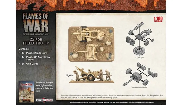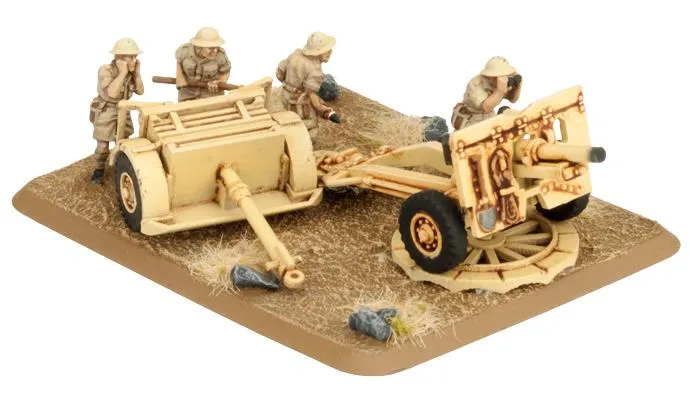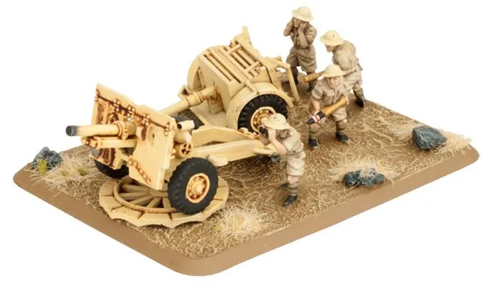 The versatile Quick-Firing 25-pounder entered service just before the war began, and remains the main British field gun and howitzer throughout the desert war. Its main ammunition is an 11.5kg (25lb) 87.6mm high-explosive shell, with solid armour piercing rounds also available. THIS PRODUCT CONTAINS: 4 x 25 pdr Gun Teams --- These miniatures are supplied unassembled and unpainted