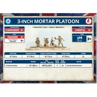 Flames of War's 8th Army 3-inch Mortar Platoon Package Contents: - 3 x Plastic 3-Inch Gun and Crew Sprues - 6 x Medium Plastic Bases - 1 x Plastic Base Insert Sprue - 1 x Unit cards Package Info: The 3-inch mortars of the battalion's mortar platoon give them immediate artillery support. The mortars are excellent for softening up the enemy before an assault and for knocking out enemy machine-gun nests. The SBML (smooth-bore muzzleloading) 2-inch mortar conducts overhead fire, throwing a 1kg (2lb) high-explosive bomb in an arcing trajectory, down onto the heads of the enemy, making it excellent at knocking out dug-in enemy troops. - Product is for use in the Flames of War Miniature tabletop game. - Models are supplied unpainted and require assembly. - Any additional scenery shown, models, paint, or glue not included. Product Part Number: BR734 Flames of War Unit's Country: British