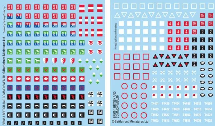Flames of War: British and Commonwealth Decals Features: -Contains 4 decal sheets for 15mm World War II British and Commonwealth Armies for the Early war and Desert War periods -2x each of the Divisional and Brigade insignia sheet and squadron markings sheet. -Decals are wet transfer.