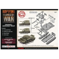 By late 1944, all of the armoured regiments equipped with Cromwell tanks had hard-hitting support tanks armed with the 17 pdr gun to tackle the better armoured German Tiger and Panther tanks. Initially there had only been enough Fireflies to give each troop one support tank. However, by the end of 1944, most had two, giving a half-and-half split between Cromwells and support tanks. The Firefly and Challenger tanks often sat back in cover, watching over the Cromwells as they dashed to the next piece of cover. Once the Cromwells were ready, they'd move up and join them, ready to repeat the process. When facing heavy tanks, the 17 pdr tanks would engage them from the front, while the speedy Cromwells worked their way around the flank looking for a side shot. THIS PRODUCT CONTAINS: 4x Cromwell Tanks that can be built as Cromwell (75mm), Cromwell CS (95mm) or Centaur (95mm) tanks 1x Firefly (17 pdr) Tank 1x Decal Sheet --- These miniatures are supplied unassembled and unpainted