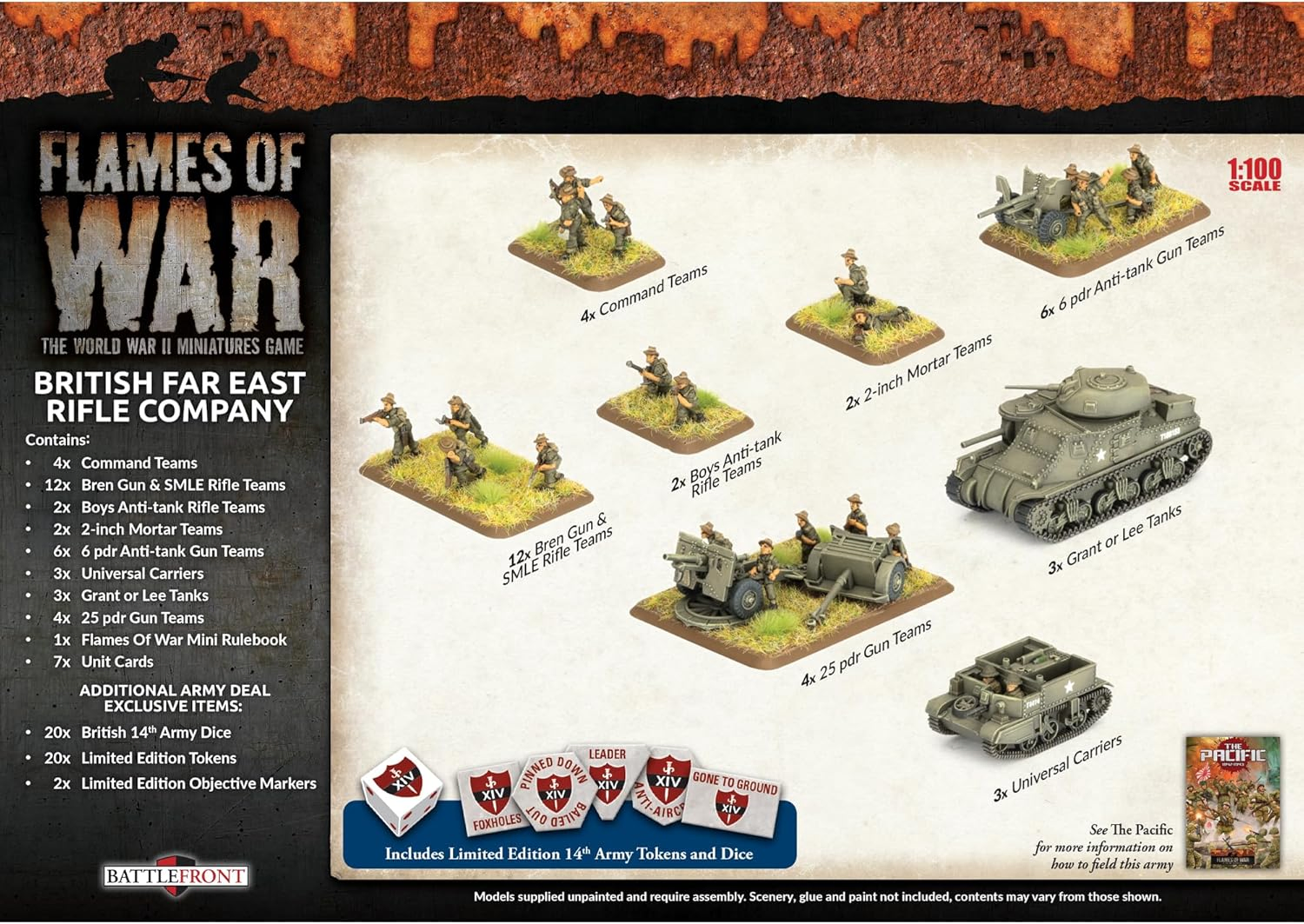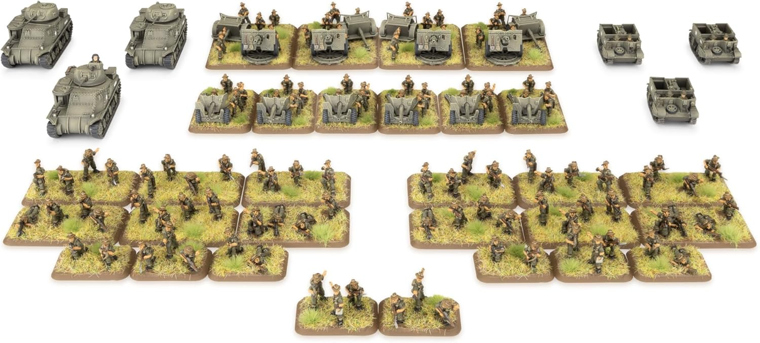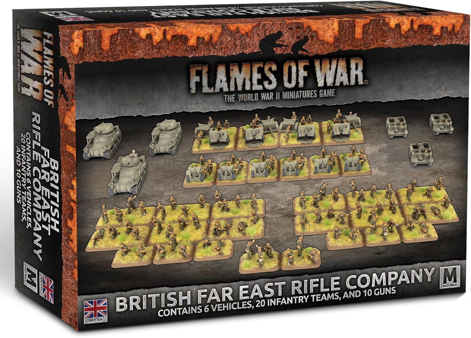 Even clothing had been adapted to the conditions with lighter summer cotton uniforms dyed jungle green. THIS PRODUCT CONTAINS: Metal and Resin Miniatures 4x Command Teams 12x Bren Gun & SMLE Rifle Teams 2x Boys Anti-tank Rifle Teams 2x 2-inch Mortar Teams 6x 6 pdr Anti-tank Gun Teams 3x Universal Carriers 3x Grant or Lee Tanks 4x 25 pdr Gun Teams 1x Flames Of War Mini Rulebook 7x Unit Cards --- These miniatures are supplied unassembled and unpainted