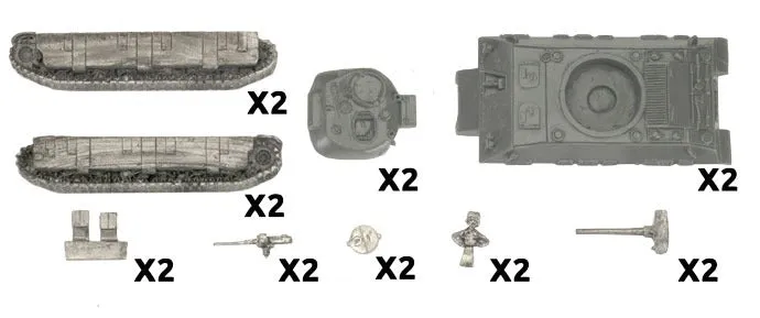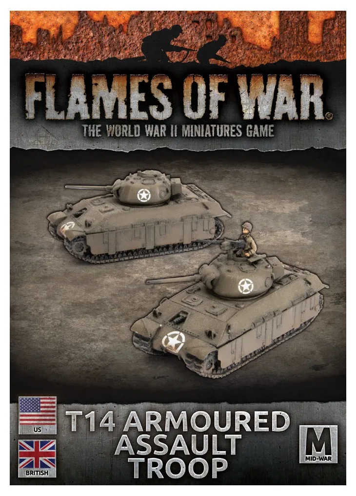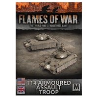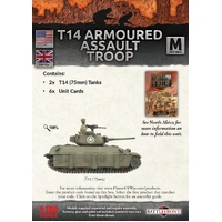T14 Armoured Assault Troop (BBX70) includes two T14 (75mm) Tanks and six Unit Cards. In September 1941, the British had expressed interest in a new assault tank as the Churchill was having teething problems. At the same time, the Ordnance Department had been looking at heavier tanks for the US Army. The T14 assault tank was seen as the solution for both these needs. The new design shared many features with the M6 heavy tank and the M4 Sherman medium tank, while incorporating British experience. The engine, transmission, and main armament were the same as the Sherman, while the tracks and suspension were based on those of the M6 heavy tank. These miniatures are supplied unassembled and unpainted