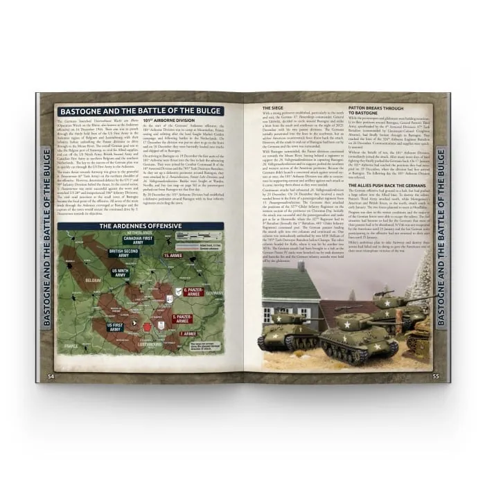Instructions on how to build a Veteran M4 Sherman (Late) Tank Company, Veteran M24 Chaffee Tank Company, M4 Sherman (Late) Tank Company, M24 Chaffee Tank Company, Battle Weary Armoured Rifle Company, Battle Weary Rifle Company, Bastogne Parachute Rifle Company, Bastogne Glider Rifle Company, M18 Tank Destroyer Company, and M36 Tank Destroyer Company. A Painting and Basing guide.