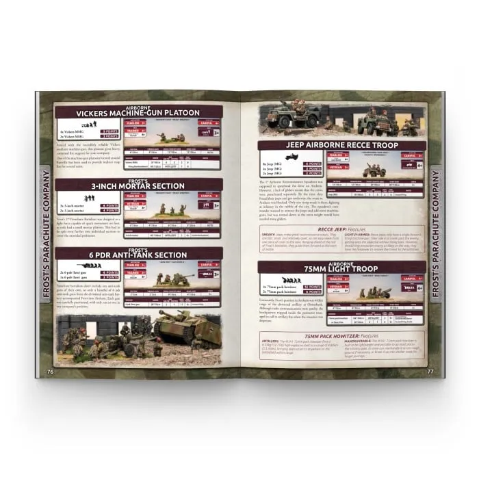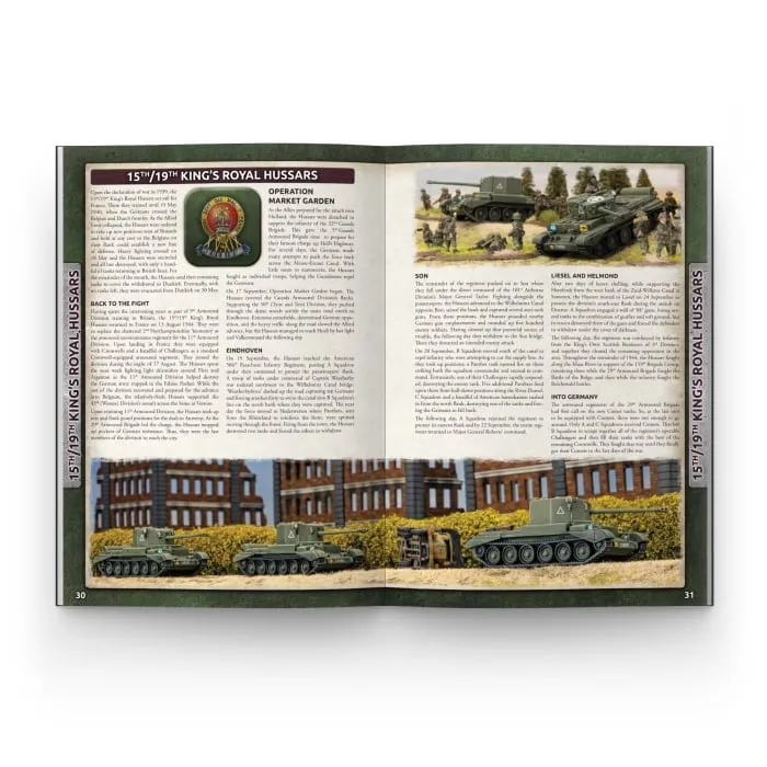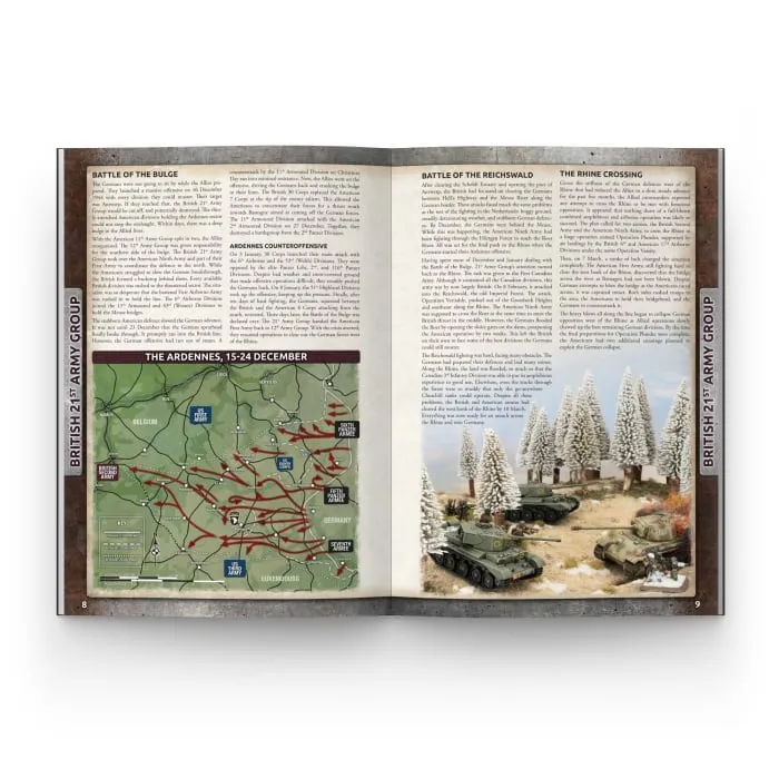 At least it wasn’t snowing. The Battle of the Bulge, back in December, was miserable. Slogging up snow-covered hills to push back the German’s last hurrah after they’d smashed through the American lines had been truly miserable. Now, four months later, it was just drizzling. Still, the Churchill’s engine made a nice warm seat, and Simon didn’t have to walk on the still-tender ankle he’d sprained parachuting into Germany to cover the Rhine crossing. CRACK! CRACK! Engines roaring, the recce troop fled back down the road. ‘88s! Dismount!’ Simon scrambled off the Churchill as it lurched to a halt, then dodged aside as the tank pivoted and pushed its way into the wood. Their gunner OP was on the ball. By the time he reached the edge of the wood, shells were exploding amongst the big German 88mm anti-aircraft guns dug in outside the next village. The Churchills joined in with their own guns, matching the Germans shot for shot. British firepower soon told on the enemy as the guns fell silent. ‘Company, advance!’ The adrenaline of battle put all thoughts of his ankle aside. Simon stepped out across the field, joining the line of paratroopers about to capture another German village. --- Following the breakout from Normandy in August 1944, the British Army made some of the fastest advances in history, racing across northern France and Belgium. When German resistance stiffened in the Netherlands, the British paused briefly to resupply, then set out again. The armoured divisions of Operation Garden pushed north to where Operation Market’s 1st Airborne Division held a precarious foothold across the Rhine, only to be stopped by the revitalised German Army. With the days of rapid advances over, the British and Canadian Armies turned to clearing the Scheldt Estuary to open the vital supply port of Antwerp, opening it to shipping in November 1944. With their supply lines secured, it was time to clear the flooded west bank of the Rhine and the dank Reichswald. Interrupted by the Battle of the Bulge, the British and Canadian attacks destroyed the remains of the German Army west of the Rhine in March 1945. The Rhine crossing led to a month of desperate battles as the British captured the North Sea ports and ended the war on the shores of the Baltic Sea. INSIDE YOU WILL FIND: Background on the British Army from Operation Market Garden to the Rhine Crossing and the final battles in Germany. Instructions on how to build a Comet Armoured Squadron, Challenger-equipped Hussars Armoured Squadron, Cromwell Armoured Squadron, Guards Sherman Armoured Squadron, Ram Armoured Squadron, Black Bull Motor Company, Guards Churchill Armoured Squadron, Kangaroo Rifle Company, Frost’s Parachute Company, and Glider Pilot Squadron. A Painting and Basing guide. Four new Amphibious-themed Missions. Amphibious Operations rules.