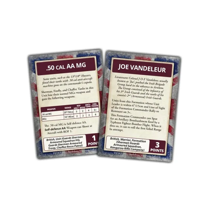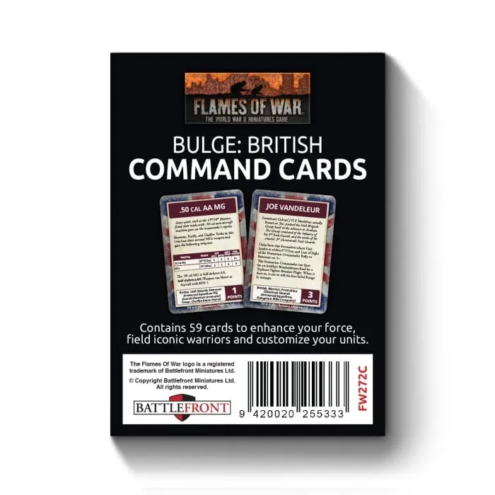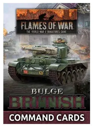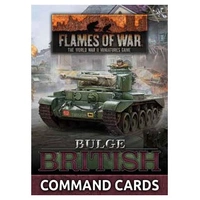 The Bulge: British Command Card pack contains 59 Command Cards Command Cards allow Flames Of War generals to field iconic warriors, build new types of units, field new types of equipment, enhance your commander’s capabilities, and bring new tactics and stratagems to the battlefield. These packs are a strictly limited release and are only available whilst stock last. INSIDE YOU WILL FIND: 59 Command Cards
