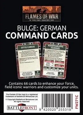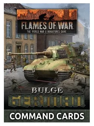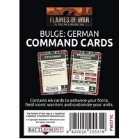 The Bulge: German Command Card pack contains 66 Command Cards Command Cards allow Flames Of War generals to field iconic warriors, build new types of units, field new types of equipment, enhance your commander’s capabilities, and bring new tactics and stratagems to the battlefield. These packs are a strictly limited release and are only available whilst stock last. INSIDE YOU WILL FIND: 66 Command Cards