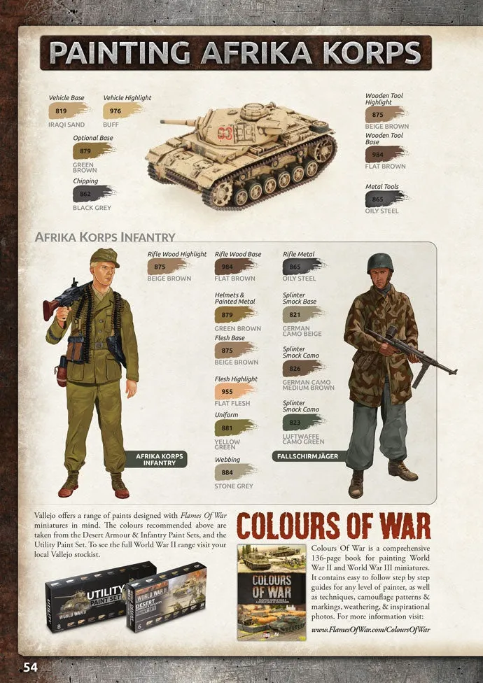 Flames of War: North Africa: Mid-War Forces (Hardcover) This book really does have everything a beginner needs: history and background, interesting formations, organisational information for building a force, and game stats for playing the game. Each army has a painting and basing guide, along with a beautifully illustrated catalogue of the available models. It is a one-stop gaming resource for the fighting in the Western Desert leading to the decisive Battle of Alamein and the close-fought battles in Tunisia that finally sealed the fate of the Axis in North Africa. This book contains army lists for German, Italian, British, and American forces. Each country has its own section, starting with a guide to some of the major battles they fought, their unique special rules, and the organisation of their forces. Each country has a selection of formations that you can field. These usually include light and medium tanks or self-propelled guns, and various types of infantry including armoured infantry in half-tracks for the Americans, paratroopers for each country, and rangers and commandos. This is followed by a selection of anti-tank guns, artillery, anti-aircraft guns, and aircraft to support your core formation. All-in-all, there are 33 different formations to choose from, or to mix and match to create your unique force.