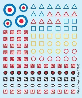 This British decal set covers the forces of the Britain and includes divisional and regimental insignias and tactical markings. It can be used for Mid-war British armoured forces. THIS PRODUCT CONTAINS: 4x British Desert Rats Decal Sheets