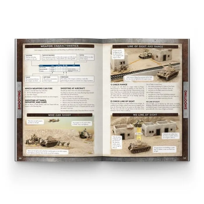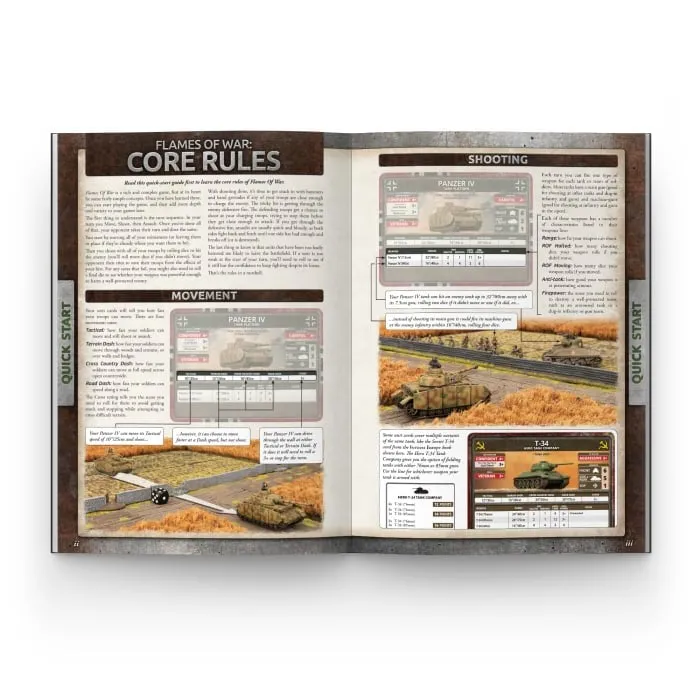 Flames Of War lets you set up a miniature battlefield with model tanks and soldiers representing the real-life troops that fought throughout World War II. You and your opponent assume the roles of their commanders, pitting your wits and cunning against one another to attain victory and, more importantly, to have fun. You can take command of a company or battalion of soldiers and pit yourself against cunning opponents on the field of battle. You will see for yourself whether the new American 'Sherman’ tank has the measure of the German panzers. You will find out if you have the guts to stop a massed charge of light tanks, or the coldblooded ruthlessness to launch one! Flames Of War combines the joys of painting and modelling your own miniature army with the challenge of facing off against your opponent across a gaming table in a social setting, and you’ll get to recreate history as it might have been! INSIDE YOU WILL FIND: Everything you need to start your Flames Of War Journey Quick Start Rules to start playing quickly Complete Rules with informative diagrams Missions Nation Specific Rules for American, British, German and Soviet Forces
