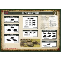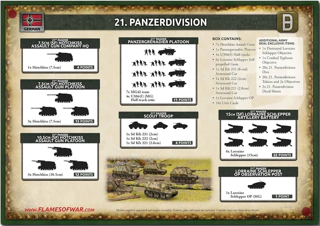 The 21st Panzer Division is one of the more colourful divisions to fight in the Normandy Campaign. Descended from Rommel's legendary Afrika Korps, they would have attracted attention anyway. On top of this, their equipment was rather unique, featuring modified French tanks giving them a unique blend of mobility and firepower. THIS PRODUCT CONTAINS: Metal and Resin Miniatures 7x Hotchkiss Assault Guns 4x U304(f) Half-tracks 6x Lorraine Schlepper Self-propelled Guns 1x Sd Kfz 231 (8-rad) Armoured Car 1x Sd Kfz 222 (2cm) Armoured Car 1x Sd Kfz 221 (2.8cm) Armoured Car 1x Lorraine Schlepper OP 1x Panzergrenadier Platoon 10x Unit Cards Additional Army Deal Exclusive Items Include: 1x Destroyed Lorraine Schlepper Objective 1x Crashed Typhoon Objective 20x 21. Panzerdivision Dice 20x 21. Panzerdivision Tokens 2x Objectives 2x 21. Panzerdivision Decal Sheets --- These miniatures are supplied unassembled and unpainted