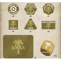 Flames of War: German Afrika Korps Gaming Set Even though they are toy soldiers, your troops react to heavy fire like real soldiers. Sometimes they get pinned down or bail out of their tanks. They can dig foxholes for protection or go to ground, hiding from the enemy. Tokens help you keep track of the state of your troops. This package contains two Objective Tokens and 20 Gaming Tokens in the following breakdown: two Ranged-In Tokens, four Foxholes Tokens, eight Pinned-Down / Bailed-Out Tokens, one Leader Token, four Gone-To-Ground Tokens and one Anti-Aircraft Token. You will also receive 16 Dice.