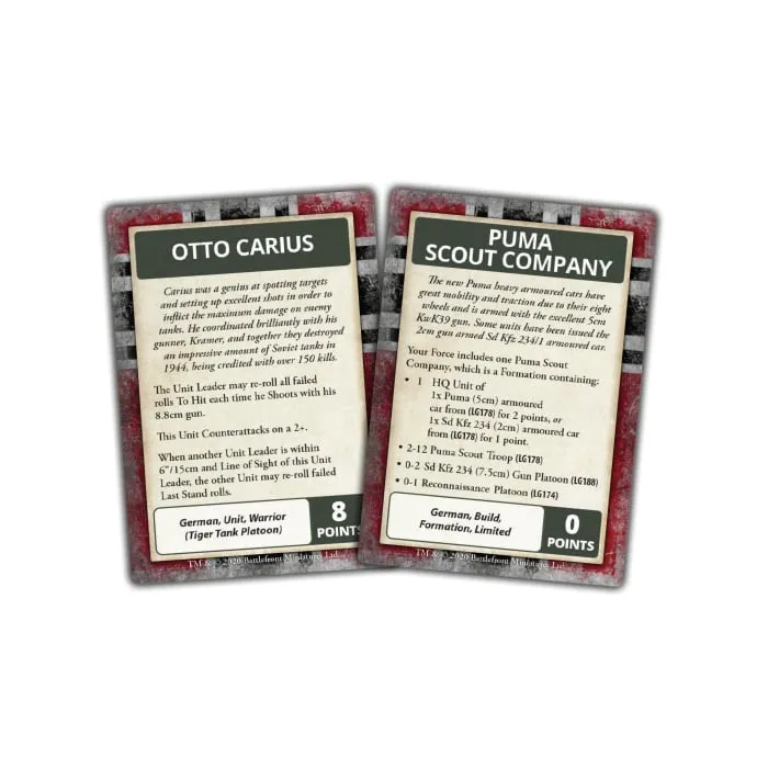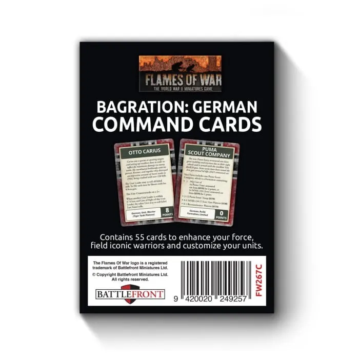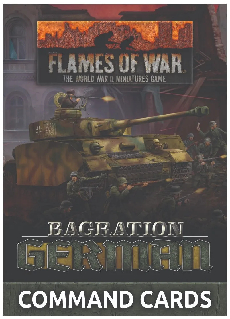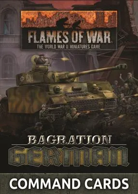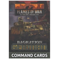 The Bagration: German Command Card pack contains 55 Command Cards Command Cards that allow Flames Of War generals to field iconic warriors, build new types of units, field new types of equipment, enhance your commander’s capabilities, and bring new tactics and stratagems to the battlefield. These packs are a strictly limited release and are only available whilst stock last. INSIDE YOU WILL FIND: 55 Command Cards