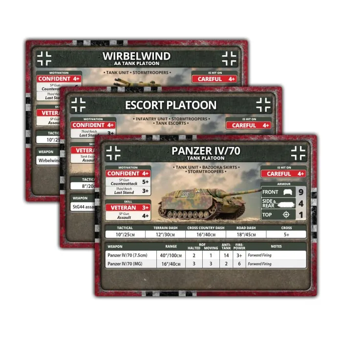 The Bagration: German Unit Card pack contains 70 Unit Cards Unit Cards are an invaluable resource to players that want to quickly look up stats and information on the units in their army, as well as building their army list when preparing for battle. These packs are a strictly limited release and are only available whilst stock last. INSIDE YOU WILL FIND: 70 Unit Cards