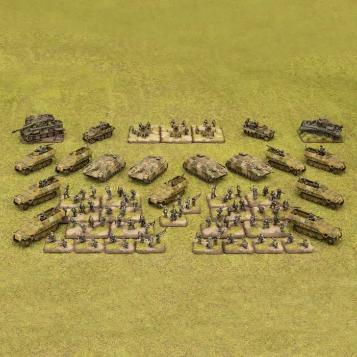 The Panzer Lehr Division was created in late 1943 from the army’s Lehr, or demonstration, formations used to validate proposed structures and tactics. The battalions were gathered early in 1944 to begin training together. By the time it went into battle, Panzer Lehr was the best-equipped division ever fielded by the German Army. THIS PRODUCT CONTAINS: 1x Panzergrenadier Company HQ 2x Panzergrenadier Platoons 8x Sd Kfz 251 Half-tracks 4x Jagdpanzer IV Assault Guns 3x 15cm Nebelwerfer Rocket Launchers 2x resin and metal Sd Kfz 10/4 (2cm) Self-propelled AA guns 7x Unit Cards Exclusive Army Deal Items: 10x Metal Panzer Lehr Infantry to theme your Panzergrenadier Platoons 1x Destroyed Tiger Objective 1x Destroyed Cromwell Objective 20x Panzer Lehr Dice 20x Panzer Lehr Tokens and 2x Objectives 2x Panzer Lehr Decal Sheets --- These miniatures are supplied unassembled and unpainted