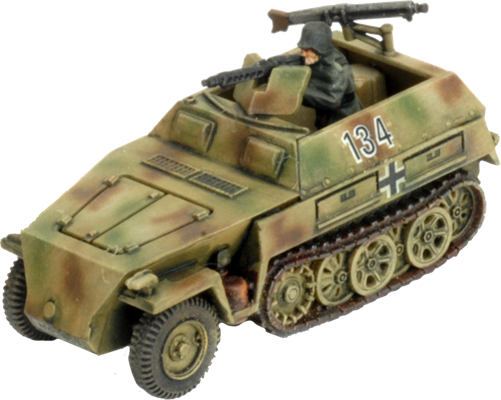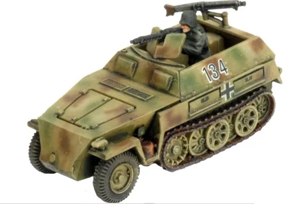 The armoured SS panzergrenadiers and their reconnaissance company brothers had a lot in common, being fanatically tough infantry mounted in armoured half-tracks. The real difference came in the form of their transport. While the panzergrenadiers fought from their big Sd Kfz 251 half-tracks, the reconnaissance company were mounted in the smaller, stealthier Sd Kfz 250 half-track. Its smaller size meant that they needed twice as many to carry a platoon, but that also meant that they had twice as many machine-guns when they needed them. THIS PRODUCT CONTAINS: 2x Sd Kfz 251 Half-tracks and 2x MP40 SMG teams --- These miniatures are supplied unassembled and unpainted