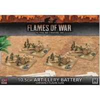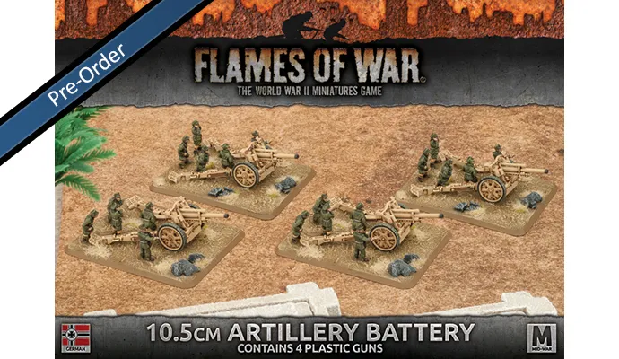 Flames of War's 10.5cm Artillery Battery Package Contents: - 4 x Plastic 10.5cm Guns - 4 x Plastic Gun Crew Sprues - 4 x Large Six-Hole Bases - 1 x Plastic Base Plug Sprue - 2 x Afrika Korps Unit Cards - 1 x Roof Package Info: The 10.5cm leFH18 light field howitzer is the standard German artillery piece, supporting their attacks and helping drive off enemy counterattacks. Firing a heavier shell than the British 25 PDR gun, it is correspondingly more effective, although less versatile in the anti-tank role. - Product is for use in the Flames of War Miniature tabletop game. - Models are supplied unpainted and require assembly. - Any additional scenery shown, models, paint, or glue is not included. Product Part Number: GBX91 Flames of War Unit's Country: German