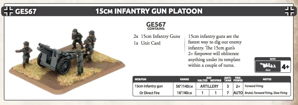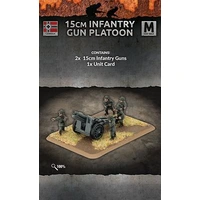 Flames of War's 15cm Infantry Gun Platoon Package Contents: - 2 Metal 15cm Infantry Guns - 1 Plastic Gun Crew Sprue - 1 Unit Card Package Info: In the Streets of Stalingrad, the 15cm Infantry Gun is the ideal tool for leveling buildings, obliterating nests, and tearing apart enemy barricades. With its impressive range and barrage capabilities, the 15cm Infantry Gun can rain explosive rounds down on the enemy with excellent accuracy and to devastating effect The 15cm Infantry Gun is best used to soften up enemy targets before an attack or to deny the enemy ground through devastating repeat bombardments. - Product is for use in the Flames of War Miniature tabletop game. - Models are supplied unpainted and require assembly. - Any additional scenery shown, models, paint, or glue is not included. Product Part Number: GE567