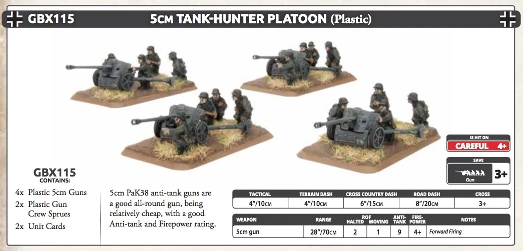 Flames of War's 5cm Tank-Hunter Platoon Package Contents: - 4 Plastic 5cm Guns - 2 Plastic Gun Crew Sprues - 2 Unit Cards Package Info: 5cm PaK38 guns are mounted on light frames so that troops can move them into difficult areas where they can surprise enemy targets. They are built low to the ground, making them easy to conceal. As Soviet tanks became more heavily armored, older anti-tank guns were replaced by the formidable 5cm PaK38 guns in late 1941. - Product is for use in the Flames of War Miniature tabletop game. - Models are supplied unpainted and require assembly. - Any additional scenery shown, models, paint, or glue is not included. Product Part Number: GBX115 Flames of War Unit's Country: German