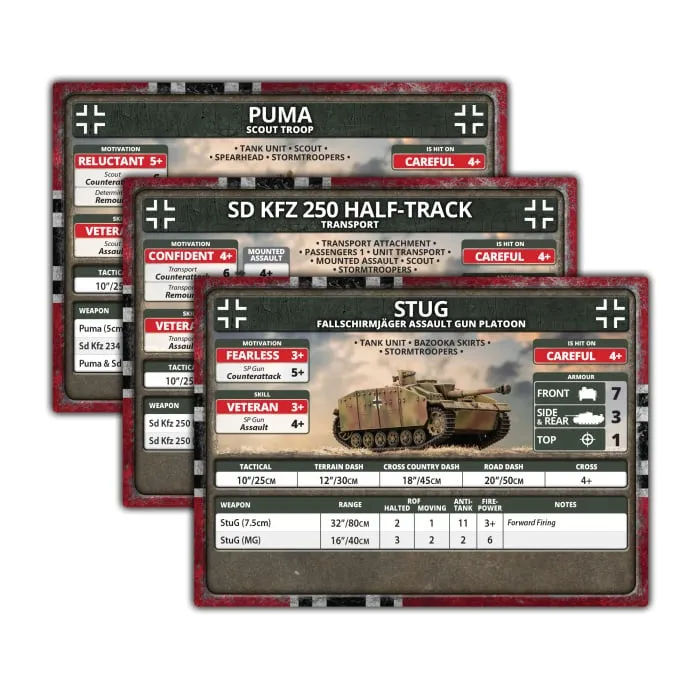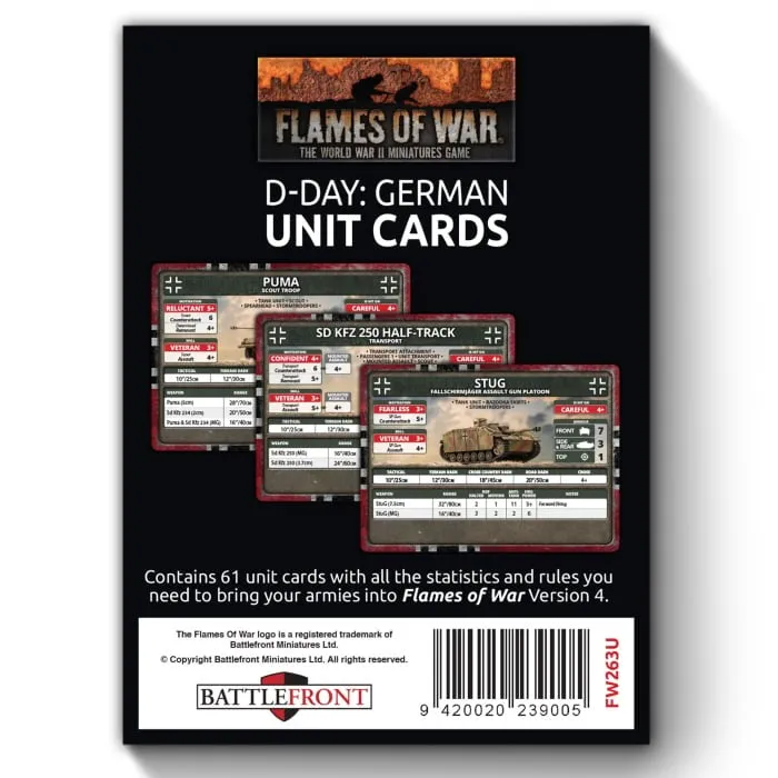 The D-Day: German Unit Card pack contains 61 Unit Cards Unit Cards are an invaluable resource to players that want to quickly look up stats and information on the units in their army, as well as building their army list when preparing for battle. Command Cards that allow Flames Of War generals to field iconic warriors, build new types of units, field new types of equipment, enhance your commander’s capabilities, and bring new tactics and stratagems to the battlefield. These packs are a strictly limited release and are only available whilst stock last. INSIDE YOU WILL FIND: 61 Unit Cards