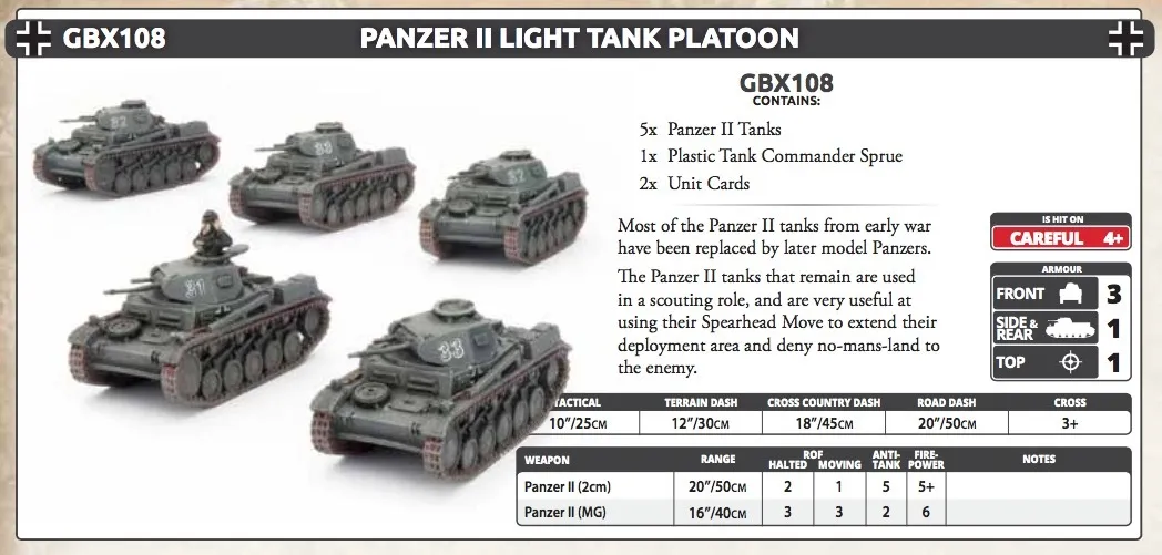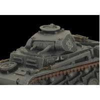 Panzer II Light Tank Platoon (GBX108) includes five resin and metal Panzer II Tanks, one plastic Commander sprue and one Unit card. The Panzer II was intended to be a training tank but, with the outbreak of war, it was pressed into service in the invasions of France and Poland. With a three-man crew—driver, commander, and radio operator— the Panzer II was the most numerous tank in the German army back during its Early-War heydey. Even then, the Panzer II only got its chance for the fact that a sufficient number of Panzers III & IV had not yet been produced. These miniatures are supplied unassembled and unpainted