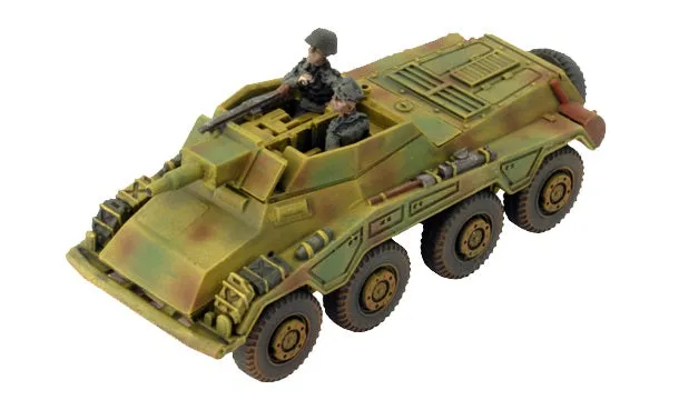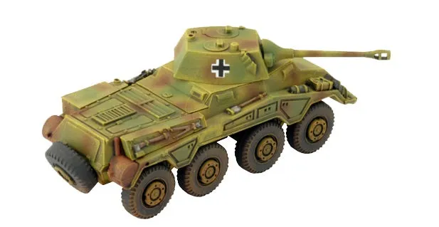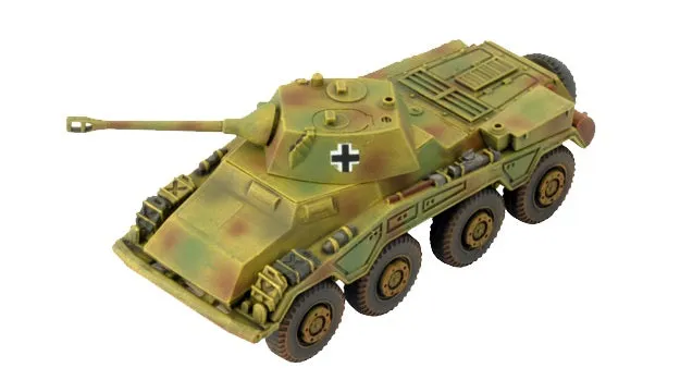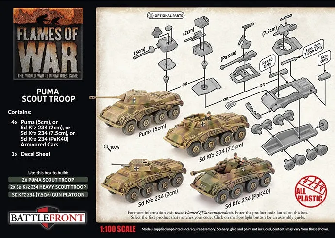 With their 5cm guns, the big eight-wheeled Puma gives the light armoured cars of the armoured reconnaissance battalions some heavier backup. However, worried that commanders would start fights rather than scouting as they are supposed to, later production switched to the Sd Kfz 234/1 with a 2cm gun. THIS PRODUCT CONTAINS: 4x Puma (5cm) or Sd Kfz 234 (2cm) or Sd Kfz 234 (7.5cm) or Sd Kfz 234 (PaK40) Armoured Cars 1x Decal Sheet --- These miniatures are supplied unassembled and unpainted