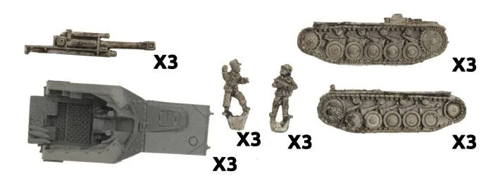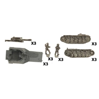 Wespe Artillery Battery (GBX132) includes three resin and metal Wespe Self-propelled Guns and one Unit card. The Wespe (Wasp) self-propelled howitzer first saw action at Kursk in 1943. Based on the reliable Panzer II chassis, the vehicle proved well suited for supporting armoured units. Its weapon was the standard 10.5cm leFH18 howitzer, which provided excellent artillery firepower to the panzer divisions they supported. The initial Wespe units had their first major engagement at Kursk and performed well in the initial phases suppressing the defending Russian troops as the Panzers rolled forward. These miniatures are supplied unassembled and unpainted