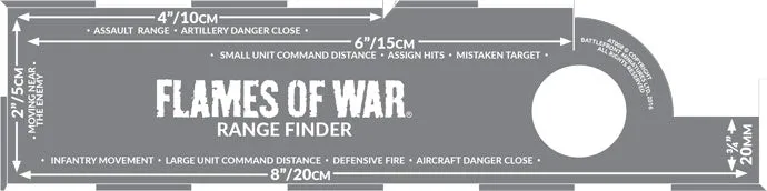 Flames of War: Etched Range Ruler The Range Finder was developed especially with Flames Of War in mind. It provides a quick reference for the range of defensive fire; command distances; movement distances and assault range. The Range Finder can quickly measure distances of ¾"; 2"; 4"; 6" and 8" in order to quickly navigate your forces around a Flames Of War battlefield. Package Contents: • 1 x Range Finder Package Info: • Product is for use in the Flames of War miniature table top game. • Models require assembly. • Any scenery, paint, or glue shown is sold separately. Country/Faction: Any Time Period: Any Product Part Number: AT013