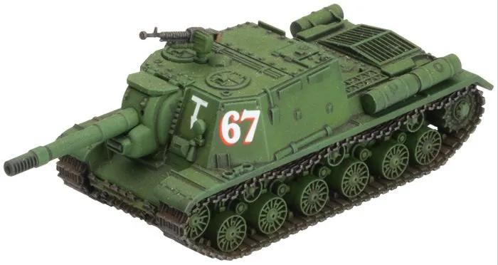 They had broken through the flattened frontline village in good time and were heading to their next objective when a shell screeched off sideways from the heavy front plate of Vladimir’s glorious new Iosif Stalin II breakthrough tank. From his seat in the turret he quickly scanned to the left, where he thought it was fired from, and saw a likely copse of trees. He found he was grinning like a wolf as he knew the gunners would be scared after fumbling their first shot. The enemy unit they were punching through were freshly constructed from remnants of battalions falling back from the fury of the Soviet summer offensive, while his regiment knew their rough business. As their tank continued to advance he ordered immediate action, “Gregory Gregorovich, shake up that stand of trees to the left with high explosive.” Then he lightly nudged the driver on the left shoulder to start angling across the burnt field to help guide the massive 122mm cannon onto the likely enemy positions. Vladimir checked through his vision blocks that the other tanks in his regiment were not having trouble, as they exited the village and straightened out their formation into the fields beyond. He could see the angled gun shield slightly silhouetted against the sunlight and bushes just before his gunner obliterated the enemy gun in a giant explosion and dust cloud. These 122mm rounds were unforgiving, he remembered being told that they held almost 4 kilograms of high explosive and generated a thick cloud of fragmentation to turn their target into borscht. They truly did respond with a double bass against the German accordion. As rifle and machine-gun fire began spattering from their heavy armour, the unit dismounted their desant troops. They then began to clear the position, with the help of their big brothers. Vladimir had time to look ahead along their route of advance and noted a few more nearby areas with obstacles that may need attention, they had to keep up their breakthrough, holding the fascists to the ground with bloody kicks. Vladimir had seen the brutality and devastation that had been sown during the Soviet retreat in 1941 and knew his unit would be key to return the favour to the Hitlerites during their renewed advance. THIS PRODUCT CONTAINS: 4x IS-2 Tanks 2x ISU-122 Assault Guns 2x ISU-152 Assault Guns 4x SU-76 Assault Guns 3x BA-64 Armoured Cars 4x 57mm or 76mm Guns 1x Hero Shock Rifle Company Complete A5 Flames Of War rulebook 1x Soviet "Start Here" Guide 2x Decal Sheets 12x Unit Cards --- These miniatures are supplied unassembled and unpainted